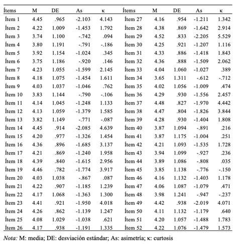 En primer lugar, se realizó el análisis de descriptivos univariados (véase Tabla 1), el cual nos indica que la mayoría de los ítems evaluados no presentan una distribución normal, ya que tienen una asimetría y curtosis que sobrepasan el intervalo (-1, 1), por lo cual, y teniendo en cuenta que los ítems son ordinales, procederemos a analizar los datos en base a correlaciones policóricas (Muthén & Kaplan, 1985, 1992).