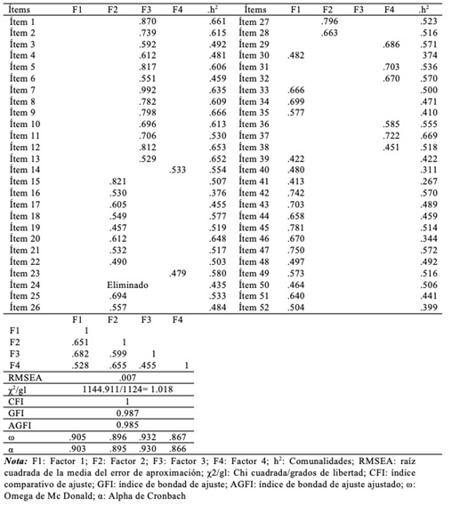 En la Tabla 2 observamos que todos los índices de bondad de ajustes son adecuados: ya que la raíz cuadrada del error de aproximación es menor de .08 (RMSEA= .007), la razón de chi cuadrada sobre sus grados de libertad es menor de 3 (χ2/gl=1.018); además el índice comparativo de ajuste (CFI= 1), índice de bondad de ajuste (GFI= .987) y el índice de bondad de ajuste ajustado (AGFI= .985) son mayores a 0.9. Asimismo, las saturaciones de los ítems en cada factor fluctúan entre .413 y .870, lo cual nos indica la estabilidad de la estructura factorial. Solo se eliminó el ítem 24 por tener una saturación inferior a .3 en todos los factores. Por otro lado, los coeficientes ω de Mc Donald y α de Cronbach de los cuatro factores son mayores de 0.8, lo cual es un indicador de la alta consistencia interna de la prueba.