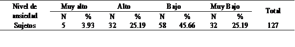 La media arrojada por la prueba corresponde a 2.53, la cual según el baremo asumido es baja, ya que se encuentra entre los valores establecidos de 2 y 2.9. La desviación es de 0.80. En cuanto la distribución de los sujetos según el nivel de ansiedad, los resultados que se presentan en la Tabla 2 muestra que el porcentaje mayor se encuentra con un bajo nivel de ansiedad, le siguen en igual proporción muy bajo y alto.