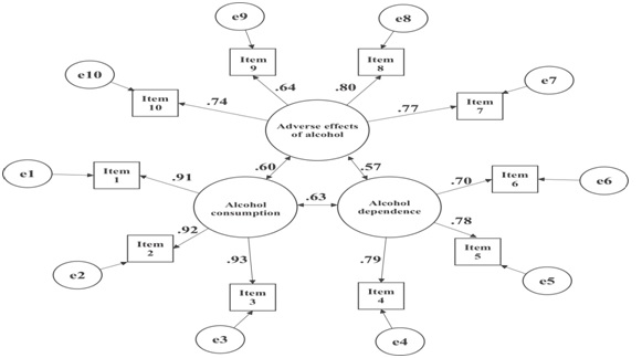 With the evidences of the factorial model assured, the next step was taken, to assess the reliability of the most appropriate model. For this purpose, Cronbach's alpha (with polychoric correlations) and McDonald’s omega were calculated, aiming to assess its internal consistency. The results indicate adequate internal consistency for all factors, namely: Alcohol consumption (α= .94; Ω= .88), Dependence of alcohol consumption (α= 0.81; Ω= 0.68) and Adverse consequences of alcohol consumption (α= .82; Ω= .66). Additionally, when treated as one-dimensional, the alpha and omega values were .85 and .89, respectively.