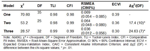 To compare the alternative models and the reference models (three factors), the difference test between the chi-squares (χ²) and the degrees of freedom (DF) of each one of them (Δχ² (DF)), considering the most adjusted model the one with the lowest χ² value, the Consistent Akaike information Criterion (CAIC) and the Expected Cross Validation Index (ECVI). In relation to these, lower values suggest a more suitable model.