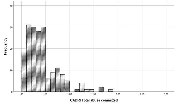 IPVUS values distribution according to the CADRI differed significantly from normal for all sub-scales and for total. Total values distribution according to the CADRI for Abuse committed is shown in Graph 1, in which the abscissa is the possible score range. Scores concentration was low; however, value for Total abuse committed was 1 or more in a 5.4% of the participants, which suggests a concerning level of violence. Out of all participants, 60.2% informed to have committed at least one act of physical violence during the index relationship.
