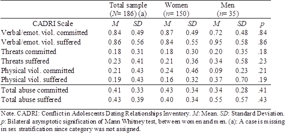 Table 1 shows descriptive statistics for CADRI sub-scales and totals, stratified by gender. Verbal-emotional violence was the subtype most committed and suffered. Parity in results stands out when they are compared between sexes (Table 1). Correlation between total violence committed and suffered was .77 (p< .001).