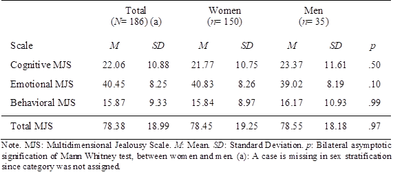 Multidimensional Jealousy Scale -MJS. The Argentine version (Delucchi et al., 2018) of MJS (Pfeiffer & Wong, 1989) was used to measure jealousy construct. This instrument was developed to evaluate cognitive, emotional and behavioral aspects of jealousy in romantic relationships. Several studies reported indexes of internal consistency with values higher than .80 (Elphinston, Feeney, & Noller, 2011; Haas Bueno & Carvalho, 2005; Lucas, Pereira, & Esgalhado, 2012; Pfeiffer & Wong, 1989; Tani & Ponti, 2016); in Argentina, alpha coefficient values of .90, .86, .88, and .88 were registered for Cognitive, Emotional, Behavioral, and Total sub-scales, respectively (Delucchi et al., 2020). Values for the sample in the present study were: .92, .87, .93, and .87 respectively.