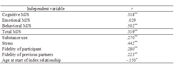 Co-variables showed an average medium stress during the index relationship (M= 4.4; SD 2.6; min. 0; max. 10) and higher level of fidelity than that of their previous partners with them (M= 2.6; SD 3.1; min. 0; max. 10 vs. M= 3.8; SD 3.2; min. 0; max. 10).