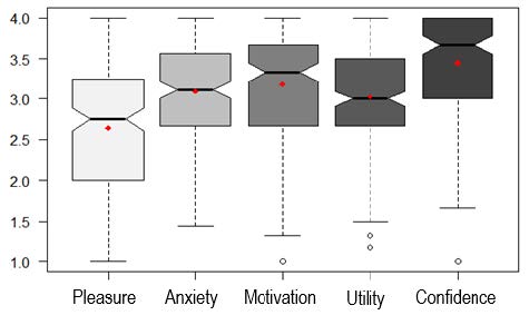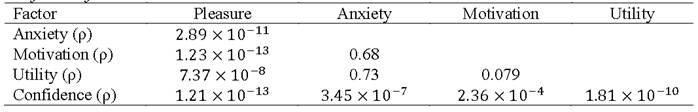 Figure 1 shows that the range of values of the liking factor is clearly wider than the other four groups. Specifically, the minimum value of the liking factor is the smallest (1). In the case of the anxiety factor, the number of small values is below 1.5. In the case of the motivation, utility and trust factors, there are outliers lower than 1.5. Additionally, it shows that the pleasure factor has a lower score in the arithmetic mean.
