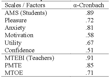 This research is a quantitative study. To determine the reliability of the results obtained, the internal consistency of the scales was analyzed with Cronbach's alpha test (Cronbach, 1951). Table 1 shows the Cronbach's alpha coefficients of the AMS and its five factors (liking, anxiety, motivation, usefulness and confidence). In addition, Table 1 shows the Cronbach's alpha coefficients for the Mtebi and its two subscales (PMTE and MOTE). George and Mallery (2003) provided the following general rules for Cronbach's alpha (α> 0.9 - Excellent; α> 0.8 - Good; α> 0.7 - Fair; α> 0.6 - Questionable; α> 0.5 - Poor; and α <0.5 - Unacceptable). In the case of the motivation and confidence factors, the Cronbach's alpha value is bad, this fact is caused because these two factors are less differentiated and specific (Auzmendi, 1992). In addition, it must be considered that both scales are composed of three items and that the internal consistency found through the Cronbach's α method tends to be lower if the number of items in an instrument is reduced (Auzmendi, 1992). It is important to note that Cronbach's alpha for the total AMS is good and for the total Mtebi it is excellent.