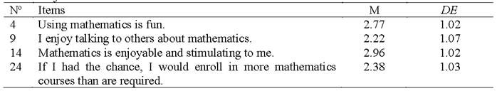Pleasure factor. Table 3 shows the scores of the arithmetic means and standard deviations obtained in the four questions of the pleasure factor. In this factor, students obtain a mean score of 2.64 (SD = .77). 54 % of students have a positive liking for mathematics. However, it must be considered that a large percentage have negative liking towards mathematics (46 %). The arithmetic mean score obtained in this factor is lower than the arithmetic mean scores obtained in the AMS (2.64 <3.07). Note that the highest score is question 14 with a mean of 2.96. On the other hand, question 9 obtains the lowest score of the mean of 2.22.