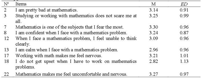Anxiety factor. Table 4 shows the arithmetic mean scores and standard deviations obtained for each anxiety factor question. In this factor, students obtain a mean score of 3.08 (SD = .63). The value of the mean score corresponding to the anxiety factor is higher than the arithmetic mean score for the attitude towards mathematics (3.08 > 3.07). In this factor, it should be taken into account that the scale is coded so that the higher the score, the lower the anxiety (Flores & Auzmendi, 2015). Considering the mean and the type of coding of this scale, it can be said that the students have a low level of anxiety. It is important to highlight that question 18 has a lower score with an arithmetic mean of 2.82; question 22 has a higher score (M = 3.27).