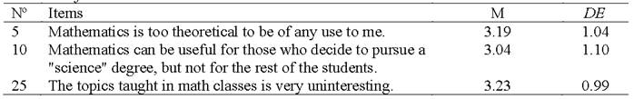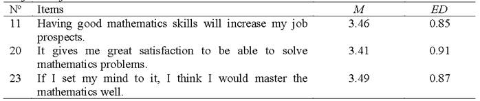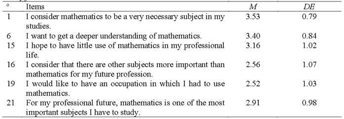 Utility factor. Table 5 shows the arithmetic mean scores corresponding to each of the utility factor questions. The mean score for this factor is 3.01 (SD = .58). The value of the mean score of this factor is lower than the arithmetic mean score of the AMS (3.01 <3.07). Considering Table 2, we can affirm that the students responded in a positive sense about the utility. In this factor, the highest score (M = 3.40) was obtained in question 6 and the lowest score (M = 2.52) in question 19. Table 5 shows that, in all the questions, the students give an answer in positive sense.