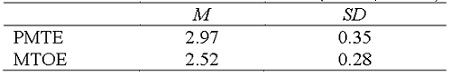 Table 9 shows the arithmetic means and standard deviations of the scores obtained by the fifth-grade teachers. Considering the values in Table 2, the teachers give an affirmation in the positive sense to the questions of the PMTE and MTOE subscale.