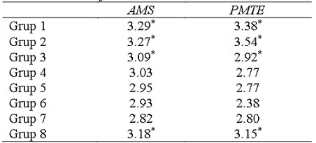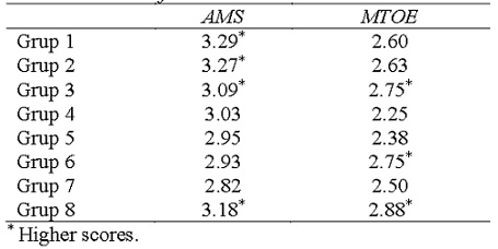 To determine which groups of students and teachers obtain different scores, the Student's t test and Anova are applied. In addition, to determine which groups have higher scores, Tukey's HSD test is applied. Therefore, it can be said that the teachers of group 3, 6 and 8 have a significantly higher mean (p <.05) than the other groups in the MTOE. Besides, students in group 1, 2, 3 and 8 have a significantly higher mean (p <.05) than the other groups in attitude towards mathematics. It can be verified that, unlike in the PMTE, the groups do not coincide. Therefore, it cannot be said that students with a higher attitude have teachers with a higher expectation of results.