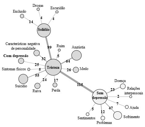 A análise da similitude gerou o gráfico da Figura 1 que se refere às representações dos adolescentes frente a depressão, contendo a frequência e a força da coocorrência entre as palavras. Segundo Abric (2003), a análise da coocorrência das categorias permite a visualização da organização da RS a partir da força com que os elementos se ligam uns aos outros. Deste modo, obtém-se uma árvore máxima que apresenta a centralidade e a conexidade dos diversos elementos.