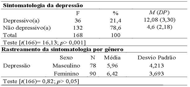 Apesar da literatura apresentar diferenças significativas em relação a sintomatologia, especificamente a depressiva, entre sexos, no presente estudo não houve diferença estatisticamente significativa entre os sexos (t(166)= 0,82; p > 0,05).