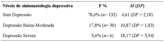 Os participantes desse estudo na subescala depressão obtiveram média 6,21 e desvio padrão 3,93 (variando de 0-21). A Tabela 1 contém a frequência da presença de sintomatologia de depressão nos participantes estudados.