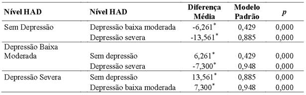 O teste Post Hoc demonstra que houve diferença significativa entre todos os níveis de sintomatologia depressiva. Ou seja, para os participantes deste estudo encontrou-se três níveis de gravidade da sintomatologia depressiva.