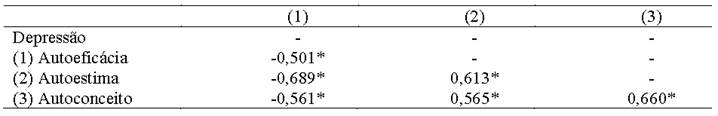 Notas: (1) = Depressão; (2) = Autoeficácia; (3) = Autoestima. * p < 0,001.