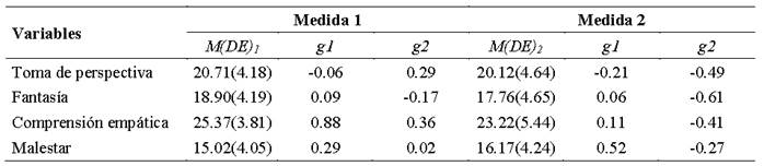 Notas: M: Media; DE: Desviación estándar; g1: Coeficiente de asimetría; g2: Coeficiente de curtosis.