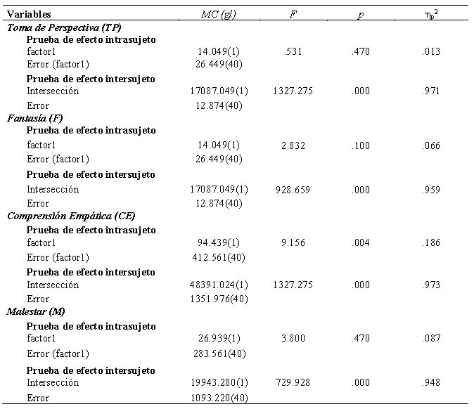 Nota: MC: Media Cuadrática; F: Estadístico de Prueba ANOVA medidas repetidas; p: Significancia estadística; ηp2: Eta Parcial al Cuadrado. Prueba de Efecto Intra-Sujeto: Evalúa la variabilidad de las mismas medidas en las personas. Prueba de Efecto Inter-Sujeto: Evalúa la variabilidad entre las mismas medidas entre las personas.