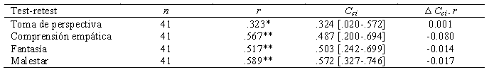 Cabe mencionar que la evidencia de fiabilidad por el método de estabilidad temporal (test-retest) ya ha sido utilizada en el análisis psicométrico del IRI, encontrándose en estudios en población española (Carrasco, Delgado, Barbero, Holgado & Del Barrio, 2011), belga (De Corte et al., 2007) y chilena (Fernández, Dufey & Kramp, 2011), en cuyos casos se logró constatar una correlación test-retest entre moderada y alta.