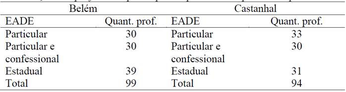 Este estudo foi realizado com 193 professores da educação básica, atuantes em classes regulares da educação básica nos municípios de Belém e Castanhal, ambos localizados no estado do Pará, região norte do Brasil. Trata-se de uma amostra de conveniência, não aleatória. A Tabela 1 apresenta a distribuição dos professores por escola e por município.