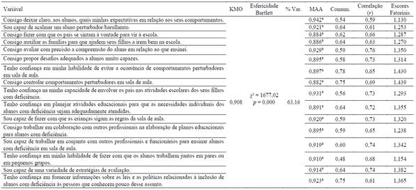 Tabela 2: Estatísticas resultantes da aplicação da técnica de análise fatorial as variáveis necessárias à construção do índice de autoeficácia docente em práticas inclusivas