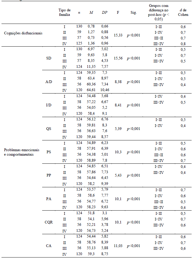 Além dos resultados hipotetizados sobre as diferenças entre os tipos de família I e IV, também foram observadas outras diferenças com significância estatística. Aquelas com tamanho de efeito médio ou grande (d ≥ 0,5) serão apresentadas a seguir. Quando os grupos com alta afetividade (I e II) foram comparados, aquele em que o conflito era baixo (tipo I) apresentou resultados significativamente menores em algumas variáveis, sendo médios os tamanhos de efeito para cognições disfuncionais, sintomas depressivos, ansiedade/depressão, queixas somáticas, problemas sociais, problemas de atenção e comportamentos de quebrar regras e agressivo. Nas comparações entre os grupos com baixa afetividade (III e IV), também o grupo com baixo conflito (tipo III) apresentou menores médias em algumas variáveis, sendo que as diferenças tiveram tamanhos de efeito grande para cognições disfuncionais e médios para sintomas depressivos, isolamento/depressão, problemas sociais, comportamento de quebrar regras e comportamento agressivo. Cabe destacar que não foram encontradas diferenças significativas entre os pares de grupos nos quais não há variação do conflito (I e III; II e IV).
