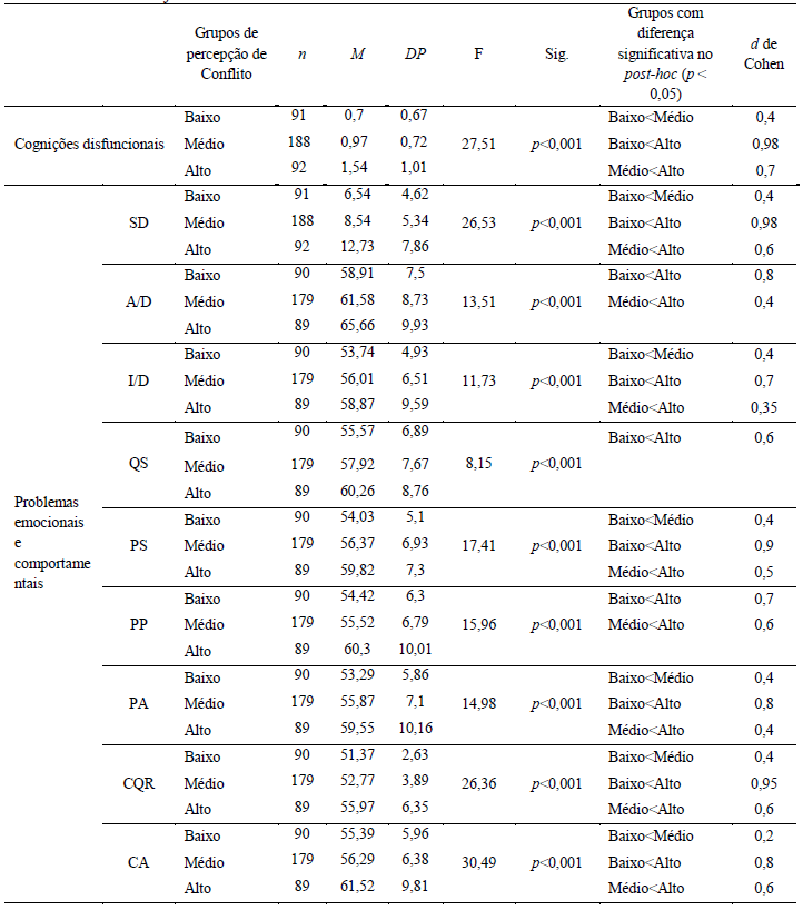 Nos resultados com as cognições, a ANOVA foi significativa (F(2,368) = 27,511, p < 0,001) e o post-hoc de Bonferroni revelou que as cognições disfuncionais variam significativamente entre os três grupos de conflito (baixo < médio < alto). Tamanhos de efeito grande e médio foram encontrados nas comparações entre os grupos baixo e alto, e entre os grupos médio e alto conflito, respectivamente. A ANOVA também foi significativa em todas as comparações conduzidas com os PEC (baixo < médio < alto). Destacam-se aqui as diferenças com tamanhos de efeito grandes entre os grupos baixo e alto conflito em sintomas depressivos, ansiedade/depressão, problemas sociais, problemas de atenção, comportamentos de quebrar regras e agressivo. Entre os mesmos grupos os tamanhos de efeito foram médios em isolamento/depressão, queixas somáticas e problemas de pensamento. Também foram encontradas diferenças com tamanho de efeito médio nas comparações entre os grupos médio e alto conflito para sintomas depressivos, problemas sociais e de pensamento e comportamentos de quebrar regras e agressivo.