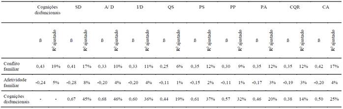 Tabela 3: Efeito das percepções de conflito e afetividade familiares e das cognições disfuncionais sobre os PEC