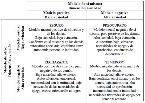 Siguiendo los planteamientos de Bowlby (1991), Bartholomew y Horowitz (1991) propusieron que, en el apego adulto, el modelo interno de sí mismo está ligado a las representaciones del sujeto sobre su propia valía y que hacen que se sienta merecedor o no de cuidado y afecto, en tanto que el modelo del otro está vinculado con las expectativas de disponibilidad y receptividad que el sujeto tiene de las demás personas. Bartholomew y Horowitz (1991) plantearon que ambos modelos podían presentarse en positivo o negativo, dando lugar a cuatro estilos de apego adulto: seguro, preocupado, temeroso y rechazante (también llamado evitativo o desatendido). En 1998, a partir de sus estudios, Brennan et al. definieron dos dimensiones en el apego adulto: ansiedad ante la ausencia de la figura de apego, relacionada con el modelo de sí mismo, y evitación de la intimidad en función de experiencias previas, relacionada con el modelo del otro. Todo esto se encuentra resumido en la Figura 1.