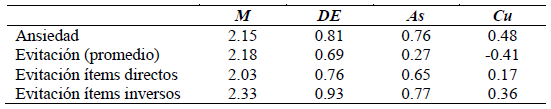 En cuanto a las diferencias por sexo, calculadas con la prueba t para muestras independientes (IC = 95 %), estas se registraron de manera significativa (p = .003) únicamente en el factor de evitación ítems inversos, en el cual el puntaje medio de los hombres (M = 2.53; DE = 0.93) fue mayor que el de las mujeres (M = 2.20; DE = 0.91).