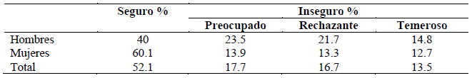 Para obtener los estilos de apego (Fraley, 2012) se utilizó la media obtenida por cada participante en las dimensiones de ansiedad y evitación, de manera que los puntajes entre 1 y 2.5 fueron interpretados como bajos y los puntajes entre 2.51 y 5 como altos. Según se observa en la Tabla 2, un mayor porcentaje de participantes mujeres evidencia un estilo de apego seguro. Por su parte, los estilos de apego inseguro (preocupado, rechazante y temeroso) se presentan en el 47.9 % de la población participante.