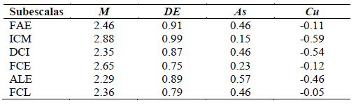 Nota: FAE: Falta de aceptación emocional; ICM: Interferencia de conductas dirigidas a metas; DCI: Dificultad en el control de impulsos; FCE: Falta de conciencia emocional; ALE: Acceso limitado a estrategias reguladoras; FCL: Falta de claridad emocional. M: Media; DE: Desviación estándar; As: Asimetría; Cu: Curtosis.