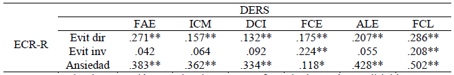Tabla 4: Relación entre factores del ECR-R y subescalas del DERS