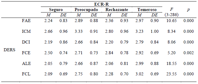 En referencia a la relación entre apego y regulación emocional, la Tabla 5 presenta los estadísticos descriptivos previos al análisis de varianza, así como los resultados de la prueba ANOVA de un factor (F) con sus respectivos grados de libertad y el correspondiente nivel de significación (p). Según se puede observar, existen diferencias significativas (p < .01) entre las medias de los cuatro estilos de apego (seguro, preocupado, rechazante y temeroso) en las seis subescalas del DERS.