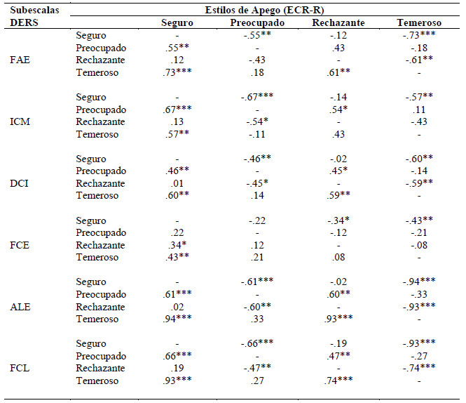 Al contrastar los resultados de ambos instrumentos, se halló que las seis subescalas del DERS se encontraban correlacionadas de manera estadísticamente significativa con dos de los tres factores del ECR-R: evitación ítems directos y ansiedad. Se halló también que únicamente las subescalas de falta de conciencia emocional (FCE) y falta de claridad emocional (FCL) del DERS se correlacionaban significativamente con el factor de evitación ítems inversos del ECR-R (Tabla 4).