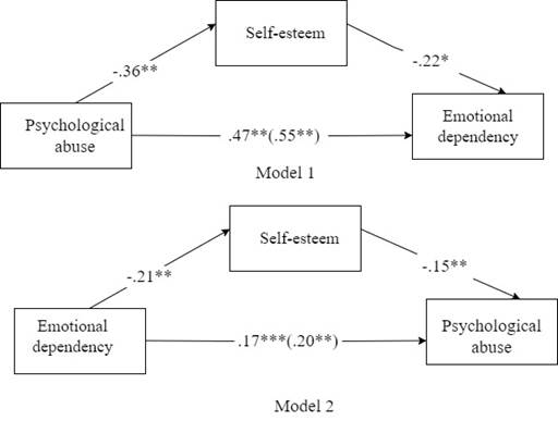 In the current pandemic scenario, the most serious consequences of abusive relationships are visible, such as physical abuse and, in some cases, feminicide. This leads to cases of psychological abuse being underreported (FBSP, 2020) It is precisely on this crucial point that we focus our research, because we analyze whether psychological abuse has a direct relation with emotional dependency, making women more susceptible to their partners' wills due to this traumatic bonding. In addition, we analyze the role of self-esteem in the relationship between psychological abuse and partner emotional dependency. We tested, in addition to this model, an alternative model in which dependency is a predictor of psychological abuse, and this relationship is mediated by self-esteem. This model is also plausible, since this process happens in a circular (cyclic) way. After all, the more dependent women are, the more they will remain in the abusive relationship, accepting all forms of manipulation due to emotional dependency (Dutton & Painter, 1981; Walker, 1979).