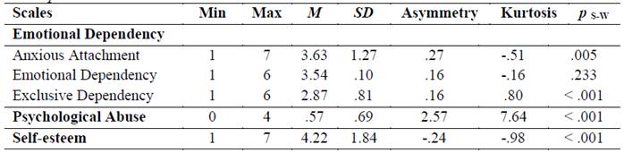 We performed descriptive statistics to analyze the mean and standard deviations of the scales in the sample. We also analyzed the Shapiro-Wilk normality test (Ghasemi & Zahediasl, 2012) to assess the distribution of the data in the sample. The more asymmetry, the further away from zero the factor will be, and the smaller the kurtosis, the less flattened the frequency curve of responses will be. We observed that emotional dependency (in all its factors) and self-esteem had asymmetry close to 0 and the most flattened curve. As for psychological abuse, it had an asymmetry more distant from 0 and more elongated kurtosis. Thus, we consider emotional dependency and self-esteem scores to have approximately normal distributions and psychological abuse to have an asymmetric distribution (Table 1). With this, all the techniques implemented below were conducted with bootstrapping of 1000 simulations for normality correction.