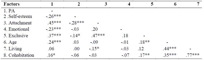 To find out if the variables have a relation between themselves, we performed a two-tailed Pearson correlation (Table 2). Psychological abuse was correlated with all factors of emotional dependency, as well as correlated with self-esteem, age of the participant and time of cohabitation with the partner. Thus, we infer that the greater the psychological abuse experienced, the lower the self-esteem and the greater the exclusive dependency and anxious attachment in the participants. The emotional dependency factor correlated negatively with psychological abuse, indicating that the greater the psychological abuse, the lower the emotional dependency. The time of cohabitation also has a positive correlation with psychological abuse, that is, the longer the time spent with the partner, the more psychological abuse the participant may suffer.
