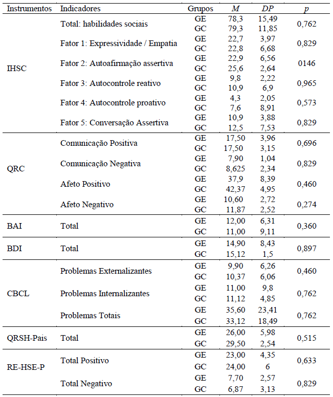 Notas: IHSC: Inventário de Habilidades Sociais Conjugais; QRC: Questionário de Relacionamento Conjugal; BAI: Inventário de Ansiedade de Beck; BDI: Inventário de Depressão de Beck; CBCL: Child Behavior Checklist; QRSH-Pais: Questionário de Respostas Socialmente Habilidosas (versão pais); RE-HSE-P: Roteiro de Entrevista de Habilidades Sociais Educativas Parentais; GE: grupo experimental; GC: grupo comparação; M: média; DP: desvio padrão.