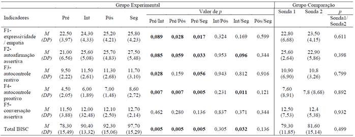 De acordo com a Tabela 2, que com exceção do fator 4 (autocontrole proativo), todas as demais medidas do IHSC tiveram melhora estatisticamente significativa nas diversas medidas (intermediária e pós-teste), com manutenção na medida de seguimento, demonstrando aumento do relato quanto à expressidade/empatia, autoafirmação assertiva, autocontrole reativo e conversação assertiva, o que levou à aumento também no escore total do instrumento. No grupo controle não houve qualquer mudança.