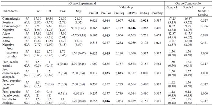 Os resultados expressos na Tabela 3 demonstram que na medida intermediária e após a intervenção houve aumento do relato quanto à comunicação positiva, bem como redução da comunicação negativa, no grupo experimental; a frequência e a diversidade de afeto positivo também aumentaram e a diversidade de afeto negativo reduziu, considerando as medidas de pós-teste e seguimento. Adicionalmente, o escore de satisfação conjugal aumentou entre pré e pós-teste. No grupo controle não houve qualquer mudança.
