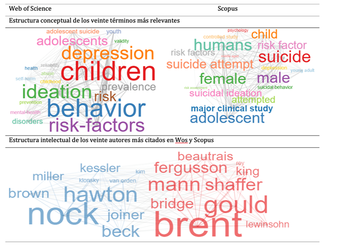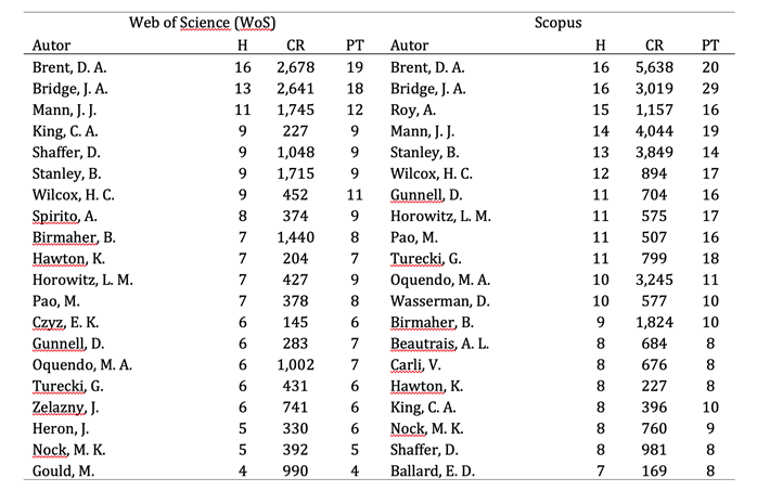 En la Tabla 2 se presentan autores con mayor cantidad de publicaciones, citas recibidas e índice H, relacionados con la producción científica sobre conducta suicida y factores de vulnerabilidad en la niñez y adolescencia. David A. Brent lidera la producción científica tanto en WoS como Scopus, con un total de 39 artículos en dichas bases de datos. También es uno de los autores con mayor número de citaciones.
