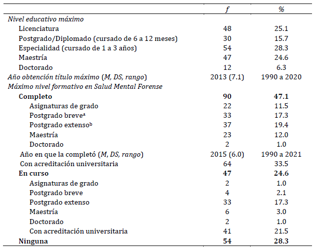 La Tabla 1 presenta las características académicas de los profesionales. Aproximadamente la mitad de ellos (n = 90) indicaron haber completado una formación específica y acreditada en Psicología Jurídica o en un área relacionada. De ellos, 64 lo hicieron en una universidad y el resto en alguna asociación o institución diferente a una universidad, generalmente asociaciones de profesionales o escuelas de formación dependientes de instituciones jurídicas o policiales. Por otra parte, 47 estaban realizando una formación específica y acreditada al momento de la encuesta, 41 profesionales indicaron realizarla en una universidad y 6 mencionaron instituciones diferentes. Se registró una correlación significativa y negativa entre edad y año en que completó la formación específica y acreditada (r = -.36, p < .001), lo que indica que los más jóvenes tienden a contar con una formación completa y actualizada.