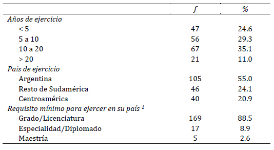 La Tabla 2 informa sobre aspectos del ejercicio profesional. Un 75 % de los encuestados contaban con cinco o más años de ejercicio profesional, e informaron diferentes requisitos para la realización de evaluaciones psicológicas en contextos jurídicos donde ejercían su práctica profesional. El requisito mínimo reportado se asoció con la región del profesional (x 2(4) = 13.80, p = .008). Un 17.5 % de los profesionales de Centroamérica reportó que era necesario contar con especialidad o nivel superior, mientras que esa proporción fue de 15.2 % en el resto de Sudamérica y de 7.7 % en Argentina. Notablemente, en ningún caso la totalidad de participantes de un mismo país o región coincidieron en el requisito mínimo requerido. Por el contrario, sus respuestas se dispersaron a lo largo de las diferentes categorías. Aquellos con un nivel educativo más alto tendieron a informar un nivel mínimo requerido más restrictivo (es decir, un mayor grado académico) que el informado por aquellos con un grado académico más bajo (c 2(8) = 32.19, p < .001).