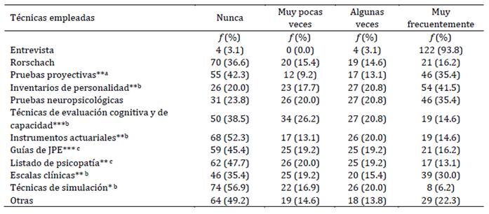 Tabla 3: Evaluación de estado mental o inimputabilidad: Uso de técnicas en el último año (n = 130)