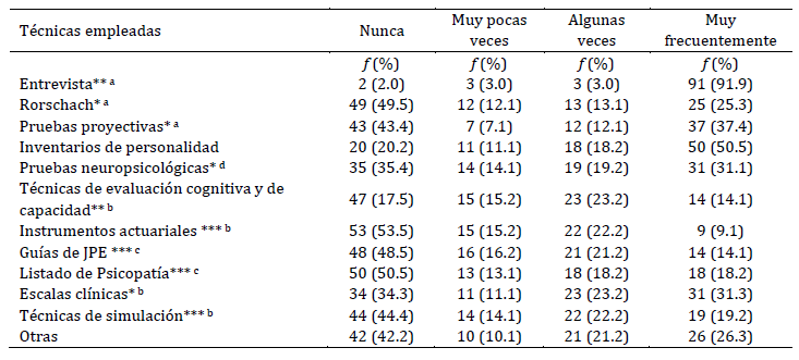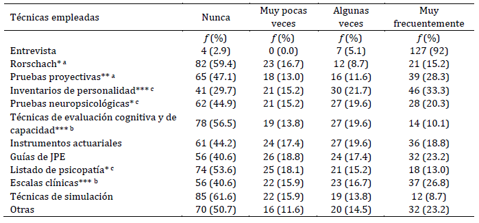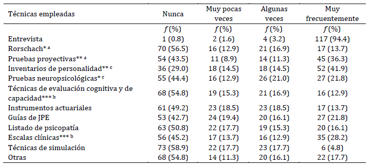 Entre quienes realizaron evaluaciones en esta área en el último año (n = 130, 68.1 %), la entrevista fue la técnica más empleada seguida de los inventarios de personalidad (Tabla 3). Hubo variaciones significativas en la frecuencia de uso de las técnicas al considerar las regiones, con una tendencia en Argentina y Sudamérica a emplear pruebas proyectivas, y en Centroamérica a emplear instrumentos estructurados (por ej., inventarios de personalidad, pruebas de evaluación cognitiva, de capacidad, escalas clínicas). Las notas al pie de cada tabla detallan las diferencias encontradas entre regiones.