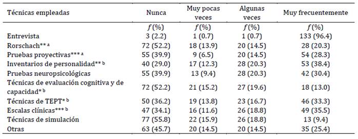 Un total de 138 profesionales (72.3 %) evaluaron daño psicológico en el último año. Los datos muestran los tres hallazgos reportados en tablas previas (Tabla 7): a) un uso predominante de la entrevista, seguida de los inventarios de personalidad, b) un uso más frecuente de técnicas inespecíficas (por ej., escalas clínicas y pruebas proyectivas) en comparación a las técnicas específicas (en este caso, pruebas de evaluación del trastorno por estrés postraumático), y finalmente, c) la preferencia por técnicas proyectivas y el Rorschach en Argentina, en comparación con Centroamérica donde se emplean más frecuentemente las pruebas psicométricas.
