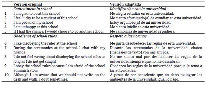 Escala de Sentido de Pertenencia (ESP; Akar-Vural et al., 2013). Es un autoinforme compuesto por 10 ítems que miden el sentido de pertenencia a la escuela en dos dimensiones: Identificación con la escuela (ítems, 1, 2, 3, 4 y 5) Respeto a las normas (ítems, 6, 7, 8, 9 y 10), que aborda la desobediencia de las normas de la institución. Los ítems de la ESP presentan un escalamiento de respuesta tipo Likert de cinco opciones de respuesta que van de 1: fuertemente en desacuerdo a 5: fuertemente de acuerdo. Las propiedades psicométricas de la medida fueron analizadas mediante un AFE con el método de componentes principales y rotación varimax, se verificaron los supuestos de adecuación muestral (KMO = .86) y de intercorrelación de los ítems (χ 2 = 1526.71; gl = 45; p < .001). La estructura de dos factores explicó el 60.72 % de la varianza y las cargas factoriales oscilan entre .68 y .86. Posteriormente, a través de un AFC con el método de máxima verosimilitud se corroboró la estructura bifactorial, Factor 1: Contentment in school y Factor 2: Obedience of school rules, los cuales obtuvieron adecuados índices de ajuste (χ 2 = .80.93; p < .001; CFI = .98; NNFI = .97; RMSEA = 0.059). También se constató la validez en relación con otras variables, identificándose correlaciones positivas significativas con los puntajes de la Escala de Soporte Social Percibido y correlaciones negativas y significativas con los puntajes de la Escala de Soledad de UCLA; en cuanto a la fiabilidad se reportaron coeficientes alfa por encima de .70, lo que corresponde a valores adecuados.