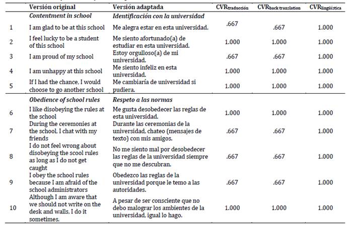 Este procedimiento se replicó para evaluar la traducción del español al inglés (back translation) los índices de acuerdo presentaron un comportamiento similar (CVR > .66). Adicionalmente, se solicitó a tres expertos en educación superior y psicología educativa, quienes observaron la pertinencia del lenguaje utilizado para cada ítem adaptado. Así, se decidió cambiar la palabra “escuela” por “universidad”, sobre estos cambios se alcanzó un acuerdo del 100 % en todos los reactivos.